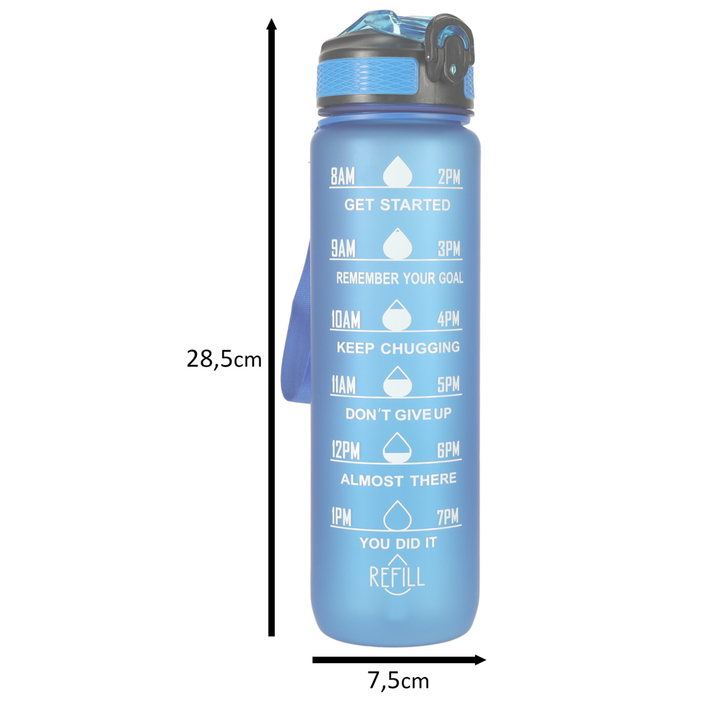 ☑️Bidon wyposażony jest w miarkę z motywacyjnymi hasłami, inspirującymi do regularnego spożywania wody w ciągu dnia. Dzięki temu wiesz ile trzeba wypić płynu, aby wspomóc swój organizm.