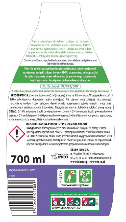 BIOSTAR ekologiczny płyn do mycia naczyń z naturalnym aloesem 700 ml
