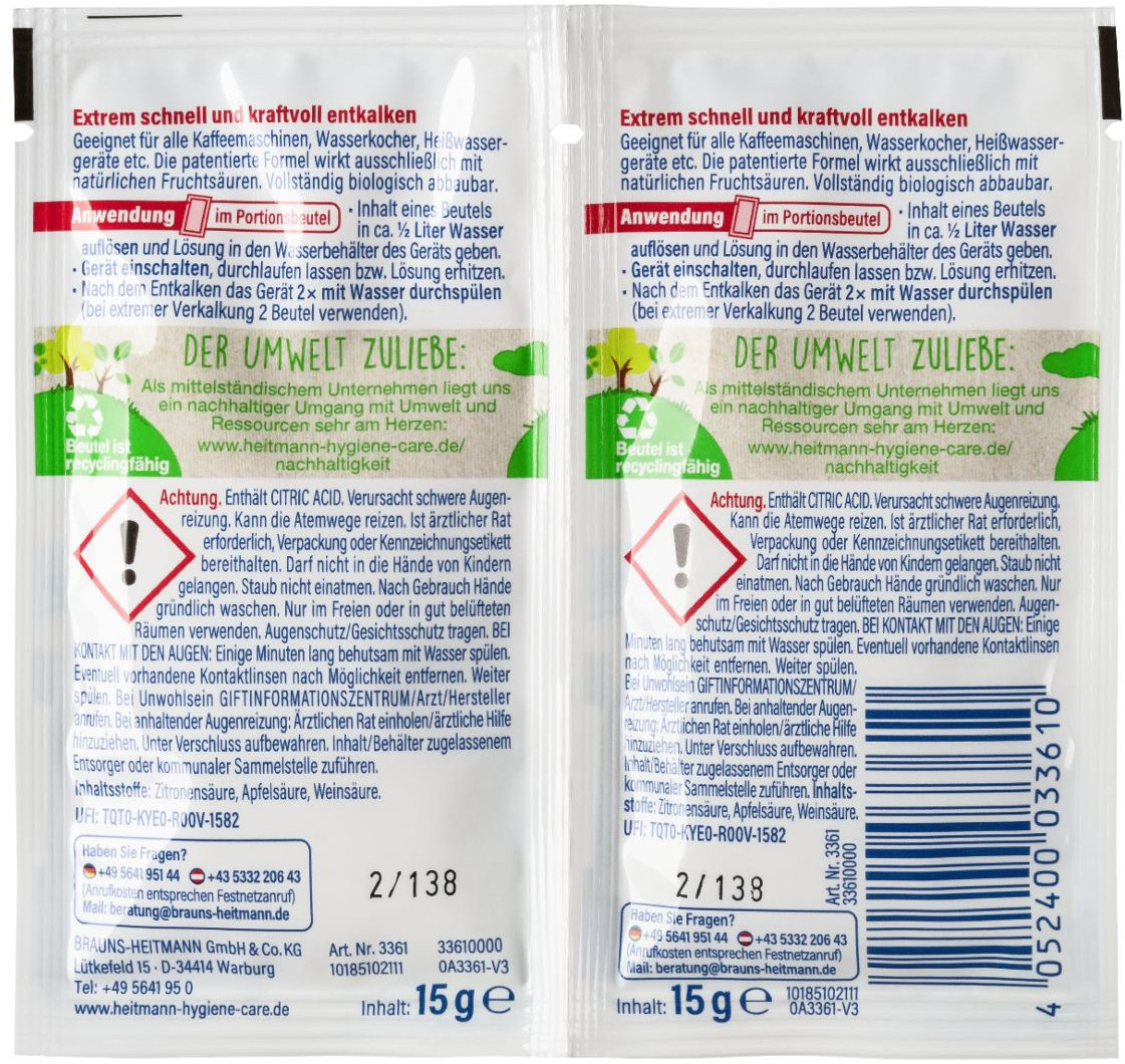 HEITMANN Szybki Odkamieniacz do Czyszczenia Ekspresu Czajnika AGD 2x15g BIO