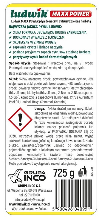 Ludwik MAXX POWER płyn do mycia naczyń cytrusy z zieloną herbatą 725g - Silna formuła usuwająca tłuszcz nawet w zimnej wodzie