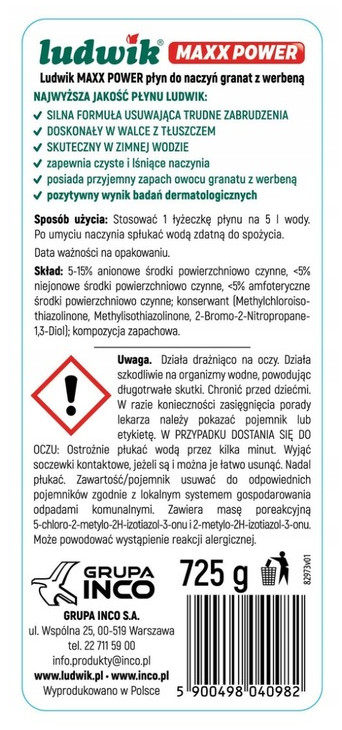 Ludwik MAXX POWER płyn do mycia naczyń granat z werbeną 725g - Silna formuła usuwająca tłuszcz nawet w zimnej wodzie