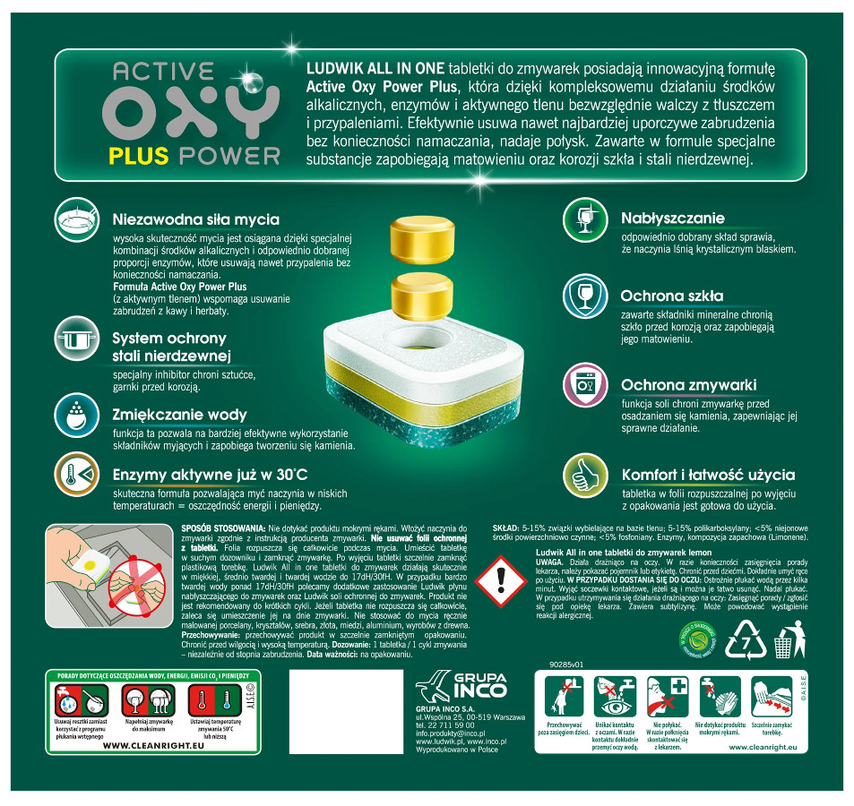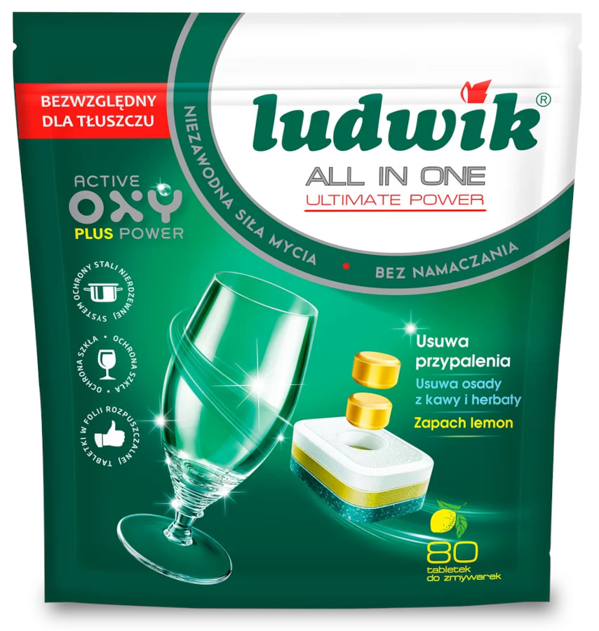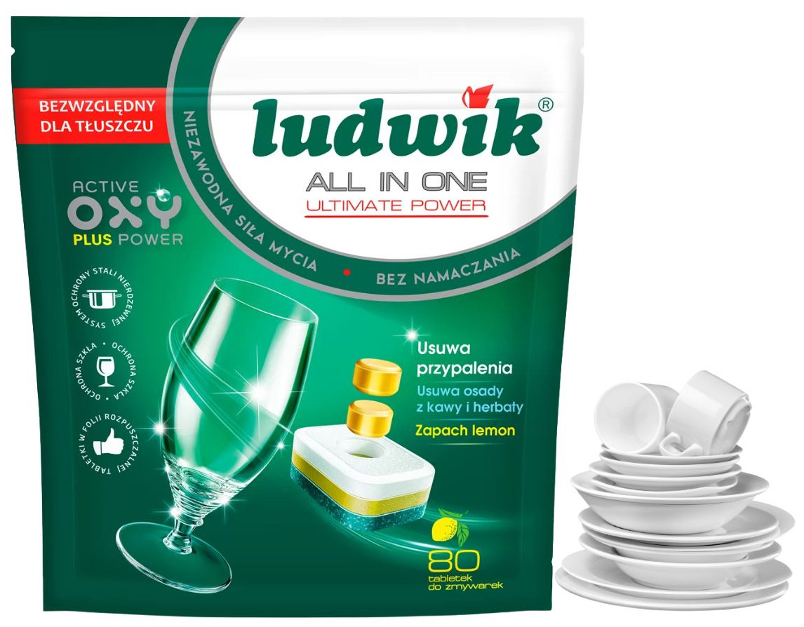 ✅ Ludwik Ultimate OXY Plus Tabletki do Zmywarki All in 1 Lemon 80 szt Tabletki do zmywarek lemon Ludwik ALL in One w folii rozpuszczalnej skutecznie usuwają nawet najbardziej uporczywe zabrudzenia.